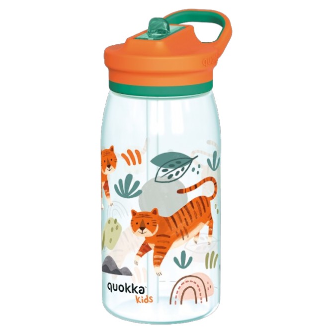Quokka GLOW Tigers s objemom 580 ml je moderná detská fľaša z odolného materiálu Ecozen, ktorá spája hravý motív tigrov s praktickou funkčnosťou. Farebný dizajn s tigríkmi a tropickými listami dodáva energiu a dobrú náladu počas celého dňa. Navyše oranžové viečko so slamkou a poistkou umožňuje pohodlné pitie jednou rukou. Okrem toho široké hrdlo pojme aj kocky ľadu. Preto je ideálnou voľbou pre školu, šport aj výlety.
