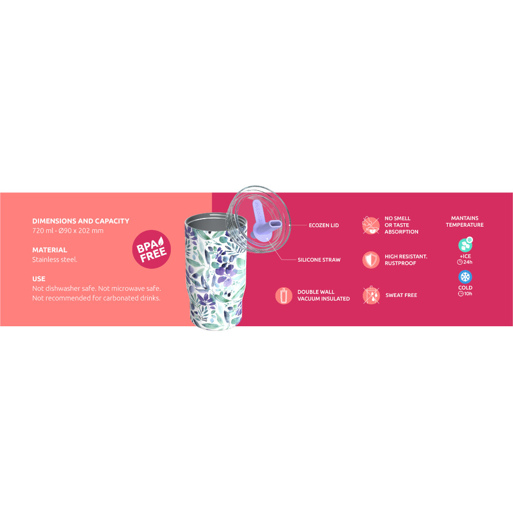QUOKKA termohrnček 720 ml MIST – Peach Petals vyniká nielen svojím vizuálnym spracovaním, ale najmä pokročilými technológiami pre vaše pohodlie. Predovšetkým vákuová izolácia s dvojitou stenou zaručuje, že váš nápoj zostane studený presne tak, ako ho máte radi, bez ohľadu na vonkajšiu teplotu. Navyše vďaka technológii Sweat Free sa na vonkajšom povrchu nezráža vlhkosť, takže hrnček zostáva suchý a nepoškodí váš stôl či obsah tašky. Okrem toho nehrdzavejúca oceľ neabsorbuje žiadne pachy ani chute, čo zabezpečuje vždy čistý a čerstvý zážitok z pitia. Taktiež je konštrukcia hrnčeka vysoko odolná voči korózii a nárazom.